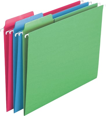 Hanging file folders are the most popular way to keep papers organized in desk drawers, file cabinets and file boxes. Each letter size hanging file folder features a 1/3-cut built-in reinforced tab and coated rod tips that slide easily in file drawers for hassle-free organizing and improved access to documents. Built-in tabs in assorted positions have a special erasable surface that makes it possible to revise and reuse folders. Write directly on tabs with permanent marker and easily erase with a standard white eraser. These 11-pt stock hanging file folders contain recycled content. Pair with the Heavy-Duty Adjustable Hanging Folder Frame (sold separately) with quick and easy two-step assembly to save time and effort.