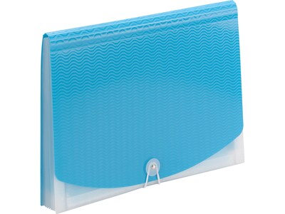 The poly frequency expanding file features a unique embossed wave pattern or "frequency" design, lending a splash of personality to the organization. It features six dividers to allow organizing by day of the week, project, or task. The bottom expands to stand upright on a desk for easy document insertion and removal. It is made of durable tear- and water-resistant poly material.