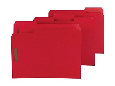Color code your office files with these bright red pressboard fastener folders. The 1/3 cut tabs have assorted positions, making it easy to locate what you need, and coated SafeSHIELD fasteners protect fingers from sharp edges. These Smead pressboard fastener folders have a 2-inch capacity for organizing a large number of documents.