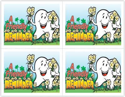 Attention-getting postcard captures your patients attention. The back of the postcard is blank so you can add a personalized message, using your own Laser Printer. Uncoated stock, perforated sheets. Four cards to an 8-1/2" x 11" sheet. 100 cards. Detached size: 4-1/4" x 5-1/2".