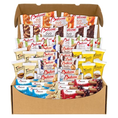Balconi Italian Pastry Snack Box is full of delectable Italian delights straight from Milan! Enjoy with your morning coffee, as a mid-afternoon treat or as a delectable dessert. The Snack Box Pros Balconi Authentic Italian Pastry Snack Box brings a taste of Italy’s finest pastries straight to your home or office. Featuring 47 individually wrapped treats, this assortment includes Italian croissants, muffins, wafers, cakes, and cereal bars, all crafted with Balconi’s signature quality. Perfect for breakrooms, dessert tables, breakfast bars, or gifting, this snack box offers a variety of flavors and textures