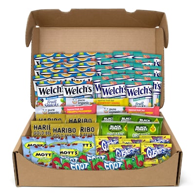- This box includes a variety of Welch's, Mott's, Black Forest, Fruit by the Foot, Pure Organic, Gushers, and HARIBO Gummy Bears