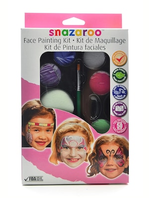 Snazaroo face paints are hypo allergenic, non-toxic, FDA compliant, and easy to remove. Each kit contains 2ml x 8 colours, 1 brush, 1 application sponge and a face painting guide. Available in Unisex, Boys, Girls, and Halloween colours. Each kit will paint up to 50 faces.Also available in the ultimate party pack kit with the contents of 2 ml black and white; 1 ml bright red, bright yellow, grass green, orange, sky blue, dark brown, royal blue, pale pink, sparkle pink, and sparkle lilac; 8 ml glitter gels in silver and star dust; together with 3 brushes, 4 sponges and a step-by-step guide. The ultimate kit will easily paint up to 65 faces.
