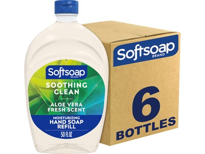 Softsoap Soothing Clean is a moisturizing hand soap refill with a fresh Aloe Vera scent, which leaves your skin feeling soft and smooth. This 50 fl. oz. bottle refills over six 7.5 fl. oz. Softsoap bottles. This liquid hand soap effectively washes away bacteria for clean and fresh hands. Feel the joy of clean with the Softsoap Soothing Clean hand soap. Confidently wash your hands with Soothing Clean while enjoying the fragrant scent and a fun label that brings joy. For everyone, every mood, and every sink, the Softsoap Soothing Clean hand soap is designed to make you feel joyfully clean. Use this liquid hand soap in the bathroom or kitchen to uplift every small moment while keeping your hands clean. Plus, this liquid soap is paraben-free, does not contain phthalates, uses 48% less plastic, and retains skin's natural moisture, so you can feel good about washing your hands.