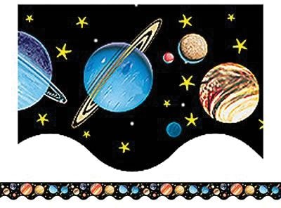 The Teacher Created Resources TCR4600 Solar System Scalloped Bulletin Border Trim includes 12 pieces in a pack and features a solar system theme that aids learning.
