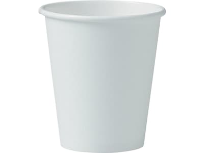 Supply drink containers for break rooms, lobbies, and other areas with these hot cups. Featuring a polyethylene lining, these cups keep liquids contained and protect against leaking, while the rigid rolled rim allows a lid to be attached. These Solo single-paper white hot cups each can hold up to 6 ounces, making them ideal for when you need a quick drink.