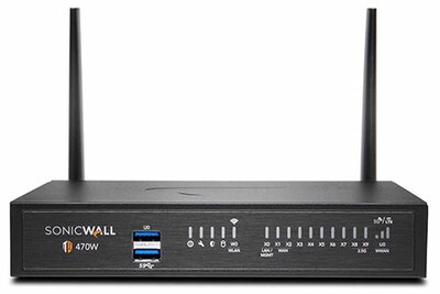 The SonicWall TZ470W Wireless Firewall is a robust security appliance designed to protect small organizations and distributed enterprises. Equipped with Wi-Fi 5, it offers advanced threat protection with a firewall throughput of 3.5 Gbps and threat prevention throughput of 1.5 Gbps. The device supports up to 250,000 DPI connections and 35,000 DPI SSL connections, ensuring comprehensive security coverage. It features multiple connectivity options, including 1GbE and 2.5GbE ports, and supports various encryption standards such as AES, DES, and WPA2. The TZ470W also includes a suite of security services like firewall protection, anti-spam, antivirus analysis, and content filtering. Its compact design, combined with a 5-year limited warranty, makes it a reliable and efficient choice for safeguarding your network.