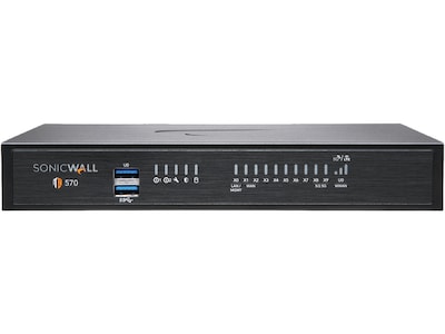 The SonicWall TZ570W is a desktop form factor next-generation firewall (NGFW) with 5 Gigabit Ethernet interfaces. Designed for mid-sized organizations and distributed enterprise with SD-Branch locations, the TZ570W delivers security effectiveness with the optimal price-performance ratio. TZ570W NGFWs address the growing trends in web encryption, connected devices and high-speed mobility by delivering a solution that meets the need for automated, real-time breach detection and prevention. The TZ570W is highly scalable, with high port density of 10 ports. It features both built-in and expandable storage, which enables various features, including logging, reporting, caching, firmware backup and more.