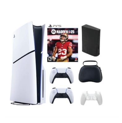 - This bundle includes the Sony PS5 Slim Disc Console, Madden NFL 25, 2 Controllers and Carrying Cases