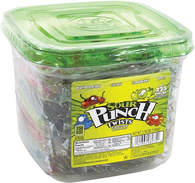 Satisfy a sweet tooth with these sour twists. This candy's individual wrappings make it easy for people to pick up a single piece or grab a handful. The packaging of these twists also makes them ideal for on-the-go consumption. This 225-piece jar of wrapped Sour Punch Twists is great for Halloween and similar occasions.