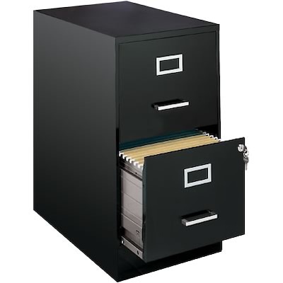 The Two Drawer Metal Vertical File Cabinet is designed for smaller professional offices or home office use. The cabinet features durable steel construction and a smart, efficient design that works well in small spaces, fitting easily under most work surfaces or office desks. Each drawer features high-sides to accommodate letter-sized hanging files. The drawers are also a perfect storage solution for other office essentials. Using commercial grade ball bearing slides, the drawer slides open and close smoothly with a three-quarter drawer extension to prevent tipping. In addition, you can keep your files and possessions secure with its locking drawers. The painted steel surface is non-porous and easy to clean. Bring storage and organization to your home or office with this stylish two-drawer file cabinet. Your office supplies and files will always be organized and within reach.