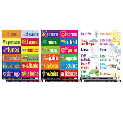 Set of versatile, durable cards for chalkboards, bulletin boards, flashcards. Features essential French vocabulary including months, days, seasons, and weather expressions. Cut them out and use these laminated cards for years. Colorful resource that motivates while teaching. Great for classroom and student reference. Made from durable stock. Perfect for the second language learner. Each set includes 36 cards. Sold as a pack of 2 complete sets.