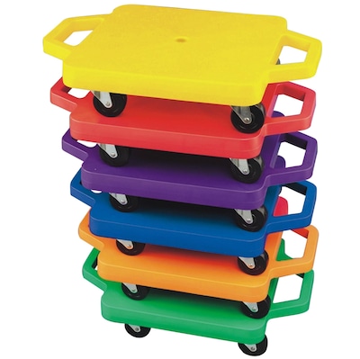 Spectrum 16" Scooter features hand protectors to safeguard fingers and hands from other scooters while playing. Scooter with non-marring casters for easy mobility is sold as 6 per set that includes red, orange, yellow, green, blue and purple colors.