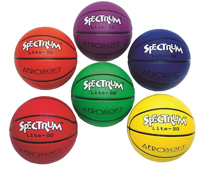 Spectrum™ Lite 80 basketball with intermediate size ball has a 28 1/2" circumference and comes with a soft foamed rubber cover. Basketball in a set of 6 includes colors of red, blue, green, yellow, orange and purple.