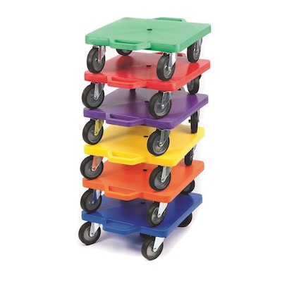 Our set of six all-surface scooters include one in each of our Spectrum colors. They feature a 16" molded plastic base with handle protectors and durable ball bearing casters with 4" diameter urethane wheels that provide extra comfort and added durability. Use our Direct-Connect (W8465) Scooter Link to connect these scooters together. Supports up to 250 pounds.