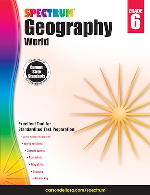 Spectrum Geography: World for students in grade 6 strengthens geography skills by focusing on early human migration, world religions, current events, ecoregions, map skills, and more. Spectrum Geography helps young learners improve and strengthen their geography skills like never before!