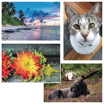 - Designs include Beach Sunset, Cat, Moose, and Yellow Flowers