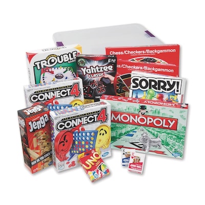 Everyone's favorite games when you need them! Fun classroom activities ready to play. Includes 2 Connect Four, 2 Combo Chess/Checkers/Backgammon games, 2 decks of Playing Cards, Monopoly, Sorry, Trouble, UNO, Yahtzee, and Jenga. Most games are suitable for ages 6 to adult. Games come in a clear storage container with locking lid. This travel-ready pack of guaranteed fun, and also easy to store.