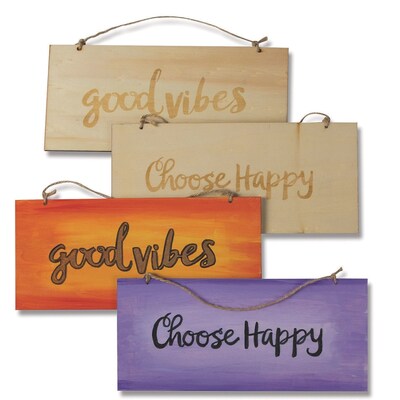 A plaque with 2 positive messages! This double-sided wood plaque has “Choose Happy” on one side and “Good Vibes” on the other. The lettering is lightly laser burned so that you can easily paint or stain the lettering and add your own designs around the edge. Perfect for wood burning, paint, stain, or marker. Jute is included for hanging. Plaques measure 10” x 4-1/2” and are 3/8” thick.