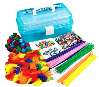 S&S® Mega trim tool boX includes 25 pom poms of 1" and 25 pom poms of 1/2", 100 chenille stems, 200 wiggly eyes, a 14 gram bag of feathers and a 1/2 lb bag of sequins. BoX has a handle for convenience and measures 12" X 6" X 6 1/2".