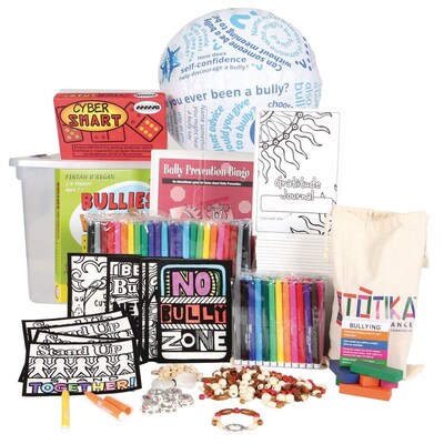 Our Game-On Against Bullying Event Kit offers a hands-on, engaging way to create a safe and inclusive school environment. Designed to support emotional wellness and mental health, this kit uses interactive activities to teach students how to recognize, prevent, and stand up to bullying in age-appropriate ways. This kit supports bully prevention by reinforcing kindness, empathy, and inclusion while promoting positive peer relationships. Through confidence-building activities, students are encouraged to become upstanders rather than bystanders. The kit strengthens social-emotional skills that help reduce conflict and foster a sense of community. It also supports school climate improvement goals, making it eligible for Title I funding, and helps build trust between students and adults—making students more likely to report bullying when it occurs. Each kit includes enough materials for 4 Powerful Prevention Stations for up to 48 students and is packed in a convenient, reusable storage tub — making it ideal for classrooms, school-wide events, or small group sessions. Journaling Station – Supports emotional wellness and self-awareness through guided prompts and gratitude practices that encourage reflection on personal values and relationships. Crafting Station – Promotes kindness and inclusivity through hands-on creative projects that celebrate differences and foster positive self-expression. Game Station – Builds fair play, teamwork, and emotional regulation with structured games that highlight cooperation and respect. Activity Station – Strengthens peer connection and a shared sense of belonging through fun, collaborative group activities. Make Bully Prevention Visible and Actionable! School bully prevention events show students that teachers, staff, and leaders are committed to their well-being and safety. These shared experiences build a culture of caring and accountability—making schools safer, more inclusive, and more successful places to learn. Note: All games and materials are age-appropriate, but we recommend reviewing content to ensure alignment with your school’s values and community needs.
