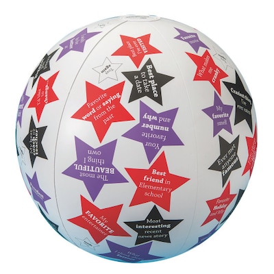 Add some physical fitness and a whole lot of fun to your next icebreaker or "getting to know each other" gathering. This awesome Toss 'n Talk-About Ball features over 60 thought-provoking topic/questions/ideas (such as "If I won a million dollars...", "A day I'd live over", "A talent I wish I had"). When the ball is caught, the player answers the topic that has been selected by the position of their thumb. Perfect for one-on one sessions or group activities and easily adapted for all age and functioning levels. 24" ball also includes a handy activity sheet with ideas for play and a repair patch.