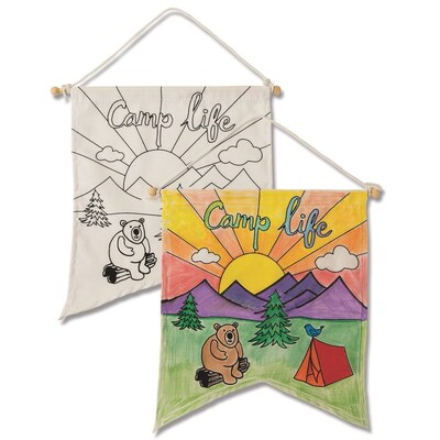 There’s nothing better than camp life! 100% cotton banner printed in velvet flocking with our exclusive illustration! Includes pre-tied cording on wood rod for convenient hanging anywhere! Flag is hemmed on all sides. A great coloring project for most ages. Perfect for camps & rec organizations. Can be colored and personalized with permanent or fabric markers, fabric paint, even tie-dyed. Decorating materials sold separately. Fabric measures approx. 8-3/4”W x 10”L. Pack of 12. Rod measures 10”L; cord measures 20”L.