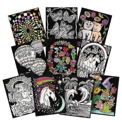 Kids will be amazed by how good their projects look as they create colors on a rich black velvet background. Raised velvet design helps kids color inside the lines so it's virtually goof-proof! One each of 10 assorted 8” x 10” designs. Color with markers, sold separately.