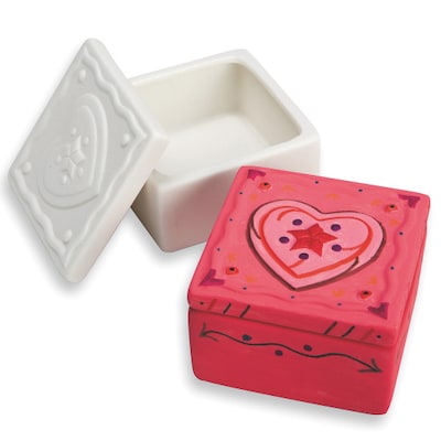 A sweet box for special treasures! Features embossed heart design on lid. We recommend decorating with acrylic paint or permanent markers. Decorating supplies sold separately. Pack of 12. Box measures approximately 3-1/4" square x 2"H.