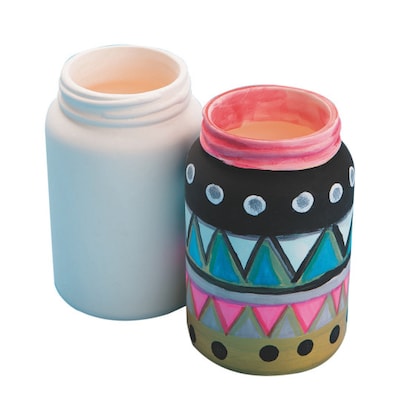 Decorate this Mason style ceramic bisque jar to create a charming vase or container. We recommend acrylic paints, glaze, or permanent markers. Jar is glazed on the inside to hold water. Decorating supplies sold separately. Measures 2-3/8” x 3-3/4”.