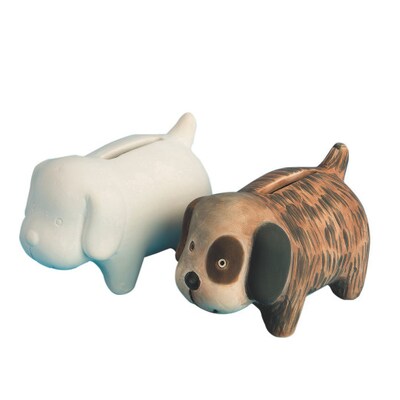 Use paint, markers, or glaze to decorate this sweet little puppy! All decorating materials are sold separately. Coin slot on top and rubber stopper at the base. They save and you save! Finished size is approximately 2-1/2 x 2-1/2 x 4".