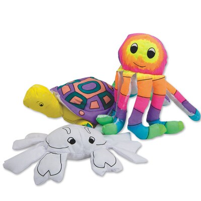 100% cotton soft sea pals to color and cuddle. 4 each of 8" x 5-1/2" crab, 8" x 11" octopus and 10" x 6" turtle. Decorating supplies sold separately. Pack of 12.