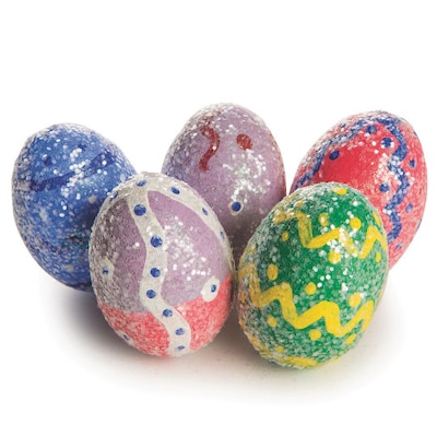 - Craft foam eggs to decorate with acrylic paint and cover with a thin layer of clear glitter to make them sparkle.