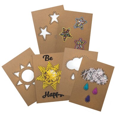 Our exclusive laser-cut picture boards make creating string art-type pictures easy and fun! Super sturdy kraft-colored chipboard has laser cut out shapes and stringing holes that are easy for everyone to weave through! Use floss or yarn to create finished pictures by simply weaving in and out of the holes in just about any order! (Stringing material and needles sold separately.) Boards can also be painted or decorated with markers if desired. Pack of 30 - 10 each of 3 designs (sun, stars, and raincloud). 5" x 7". Approx. 1.5mm thick.