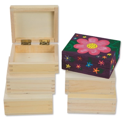 Plain small hinged box comes preassembled and unfinished. Pack of 6. Box measures 4-1/8” x 1-5/8” x 3-1/4”. Decorating supplies sold separately.