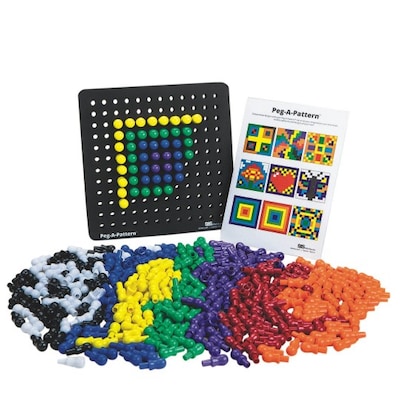 This exciting new manipulative is perfect for rigid fingers or little hands. Clients replicate the included patterns or create their own. A "shoulder" on the colorful, 1-5/8"H chunky plastic pegs gives a positive stop and helps them fit snugly into the sturdy 1-1/4" thick foam pegboard. Set includes one 12"-square pegboard, 370 pegs in 8 colors (50 each of 6 colors and 35 each of white and black) and full-color instructions with pattern design ideas.