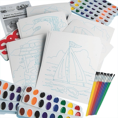 S&S Worldwide Watercolor paint-by-numbers craft kit includes assorted design panels and brushes. Craft kit has a dimension of 7 1/2" x 8 1/2" and provides attractive finish to the numbers, sold as 36 per pack.