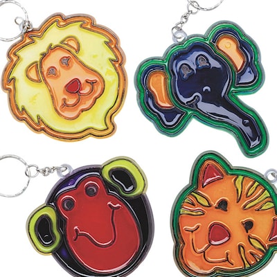 A wild group indeed! Cheerful lion, tiger, monkey and elephant designs are easy to color with glass stain. Includes sun catchers with key chains. Approximately 3" x 3". Stain sold separately. Completed project (with stain) gives a stained glass effect. Pack of 12.