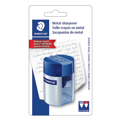 Give writing utensils a nice point with this Staedtler double-hole blue/silver tub pencil sharpener.