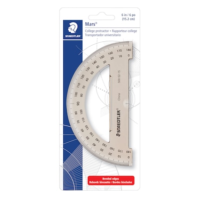 Staedtler® Mars® 180 deg protractors has 6" tinted transparent plastic and beveled center opening for easy pick-up. Protractor features graduations in 1/2 deg increments reading right to left and left to right.