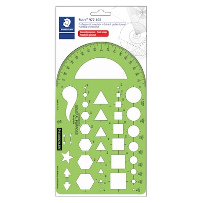 Staedtler® Mars® General purpose template measuring 9 1/2" x 5 1/2" is made of strong durable green plastic with matte-finish to reduce glare. Template features 40 geometric shapes, 180-degree protractor and" scale for more convenience.