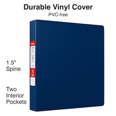 Safely store and access your documents using this Staples standard blue binder. The 1 1/2-inch D-rings allow pages to lie flat and have a 350-sheet capacity to handle large stacks of papers. The interior is designed with two pockets for additional storage options. This Staples standard binder has wider front and back panels to fully cover standard dividers and sheet protectors.