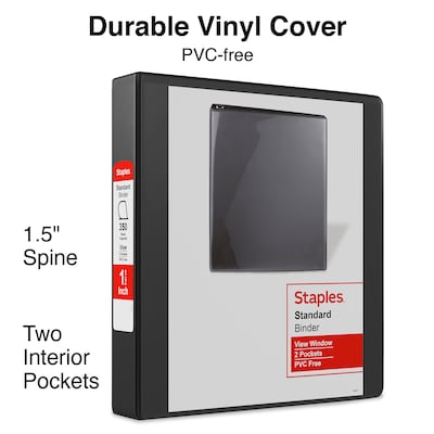 Get quick access to important papers with this black view binder. The D-rings avoid misalignment and gapping for smooth page turning each time, while the 1 1/2-inch size lets them hold up to 350 sheets of paper. This Staples standard view binder boasts two interior pockets for enhanced organization and storage options, while the wider front and back panels fully cover letter-size contents.