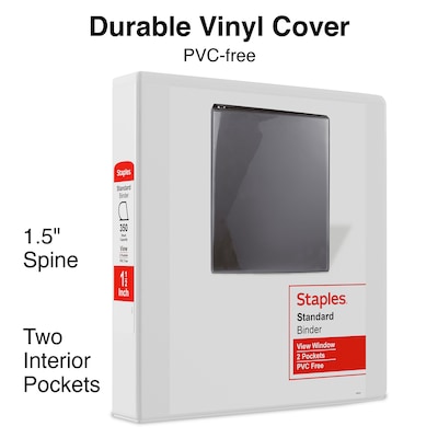 File paperwork inside this white view binder. The clear overlay offers space for a title page or custom label, while the two interior pockets provide additional storage for loose papers and small office supplies. Nonstick construction prevents ink and toner transfer, preventing document damage. This Staples standard view binder boasts locking D-rings, so you can turn pages smoothly without catching or tearing.