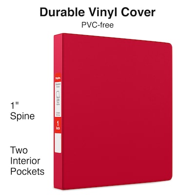 Keep important documents in this Staples Standard 220-sheet capacity 1-inch D-ring red binder. Extra-wide front and back panels cover standard dividers and letter-size papers, while the two interior pockets offer extra organization options for loose paperwork. This Staples Standard 220-sheet capacity 1-inch D-ring red binder has back-mounted rings that ensure pages lie flat, while the gap-free design lets pages turn without trouble.