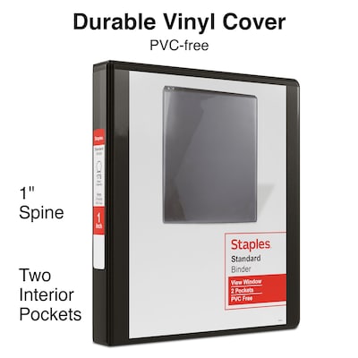 Keep records and printed material safe and easily accessible with this Staples standard view binder. The D-rings contain up to 220 sheets and let the binder lie flat for writing without removing the paper, and the archival-safe covers don't remove print or toner from pages. The wide cover panels of this Staples standard view binder completely cover documents and page dividers to protect contents for long-term storage.