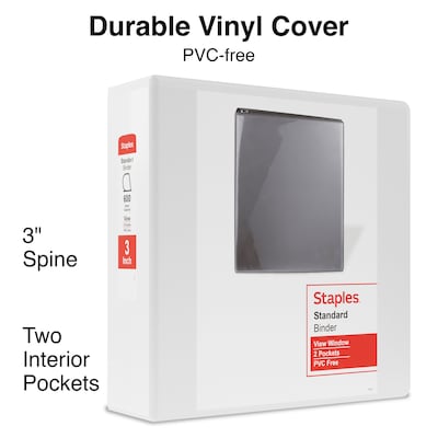 Keep your documents in one place with this view binder. With 3-inch D-rings that allow for a much higher page capacity than binders with regular rings, this binder is ideal for storing lots of papers, and the nonstick material keeps ink on the page. This Staples view binder has back rings that make it easy for pages to lie flat while the binder is open during use.