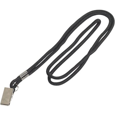 Standard Black Lanyard with Clip. Displays badges without damaging clothing. Features round, woven, nylon material. Comfortable around the neck. Bulldog clip attaches the ID badge to the lanyard for display.