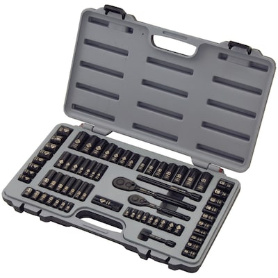 - Includes: 1/4" and 3/8" pearhead ratchets, 63 additional sockets, two 3/8" spark plug sockets, 3" and 6" extension bars, blow molded case, high-torque ratchets with highly visible etching on sockets, set exceeds ansi specs