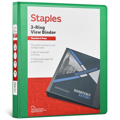 Keep documents readily accessible and protected with this Staples standard 1-inch D-ring view green binder.